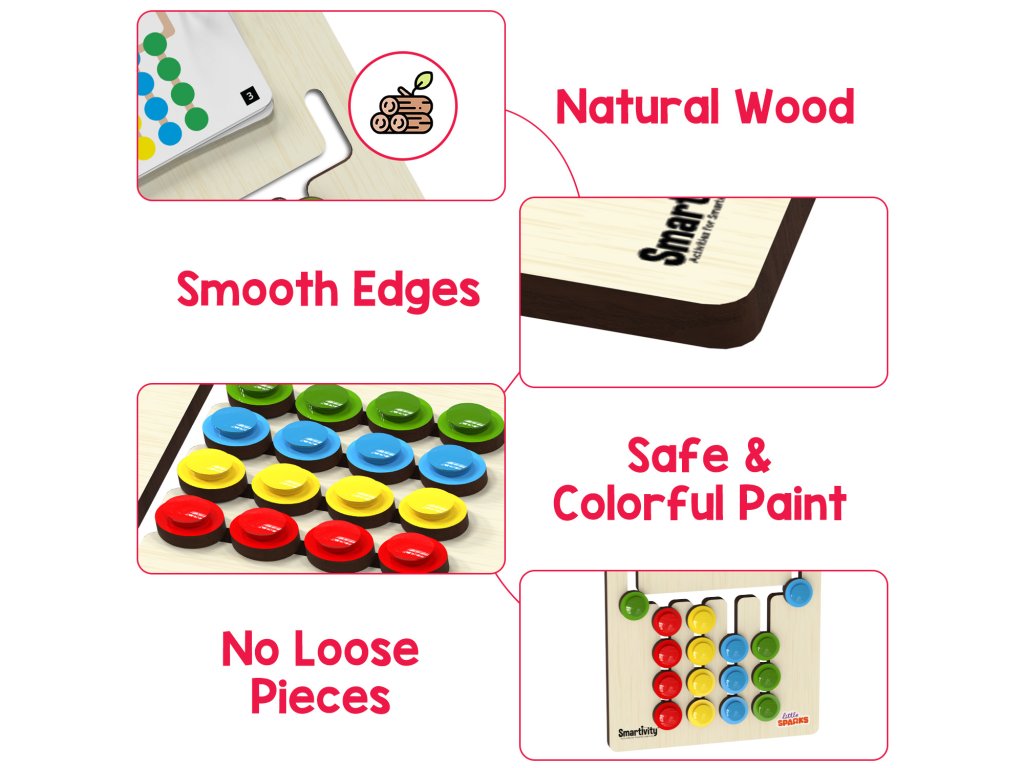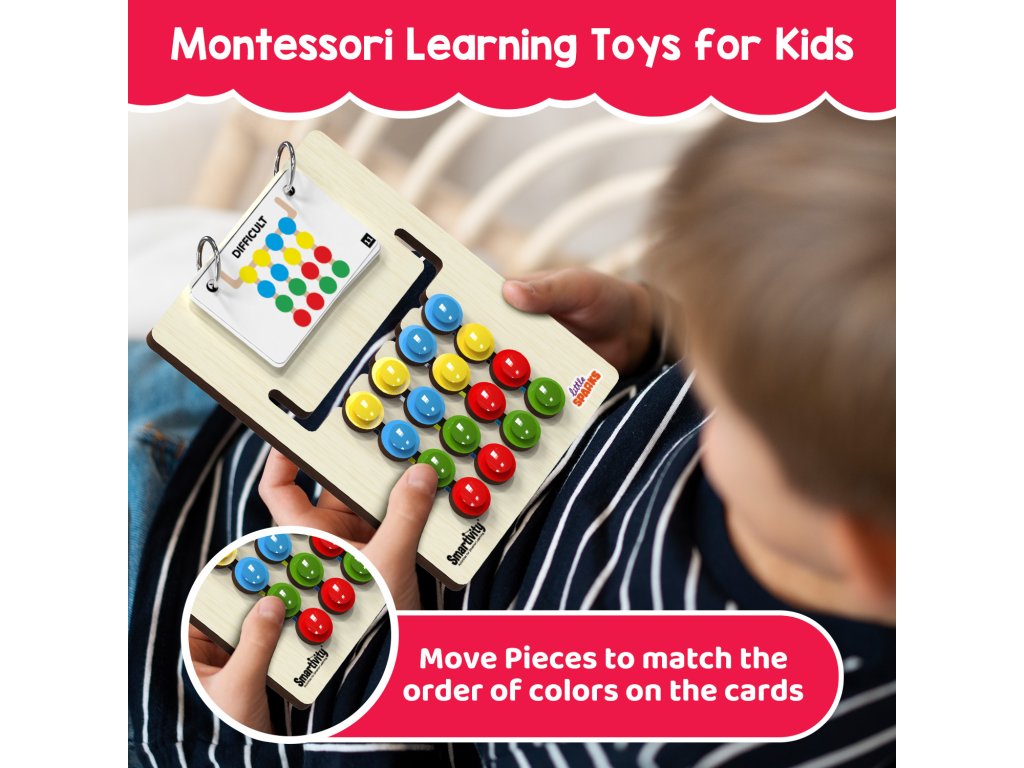 Toto barevné puzzle vyžaduje, aby dítě replikovalo barevné vzory dle 15ti přiložených karet s úkoly ve třech úrovních obtížnosti.
