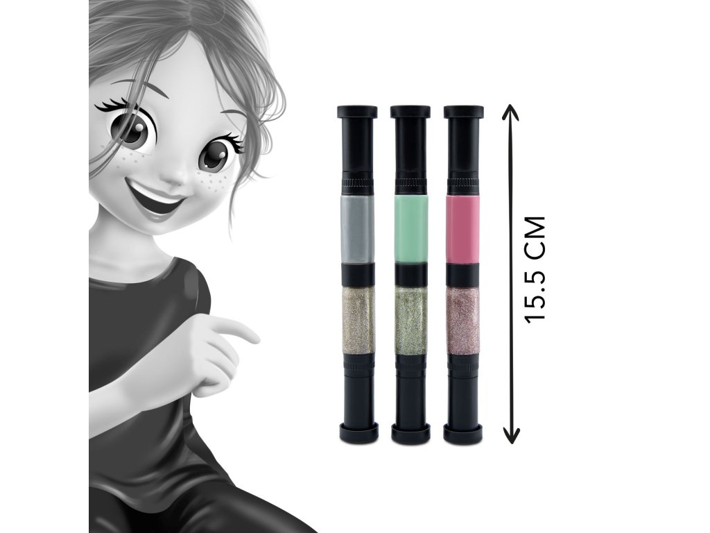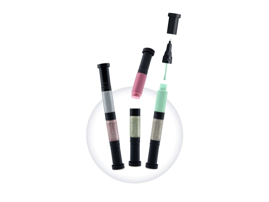 Krabička obsahuje tři pera se dvěma lahvičkami: červenou, zlatou a fialovou, standardní verzi a verzi s třpytkami. Každá lahvička má štětečkový a perový hrot.
