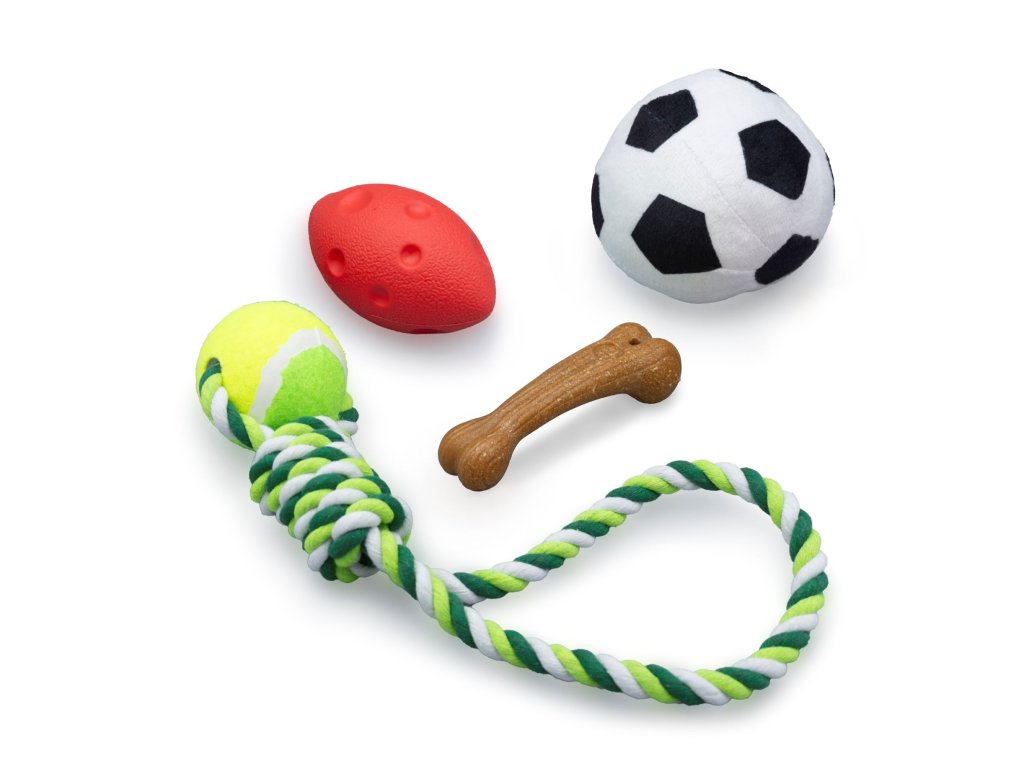 Sada čtyř zábavných hraček se sportovní tematikou pro vašeho mazlíčka.