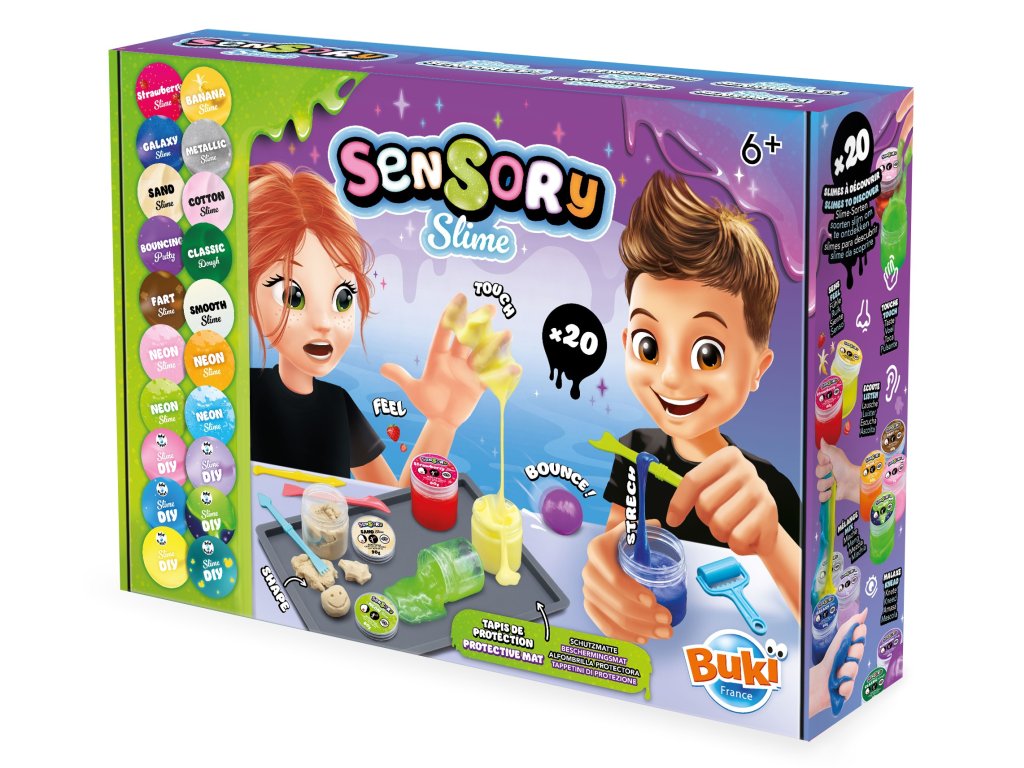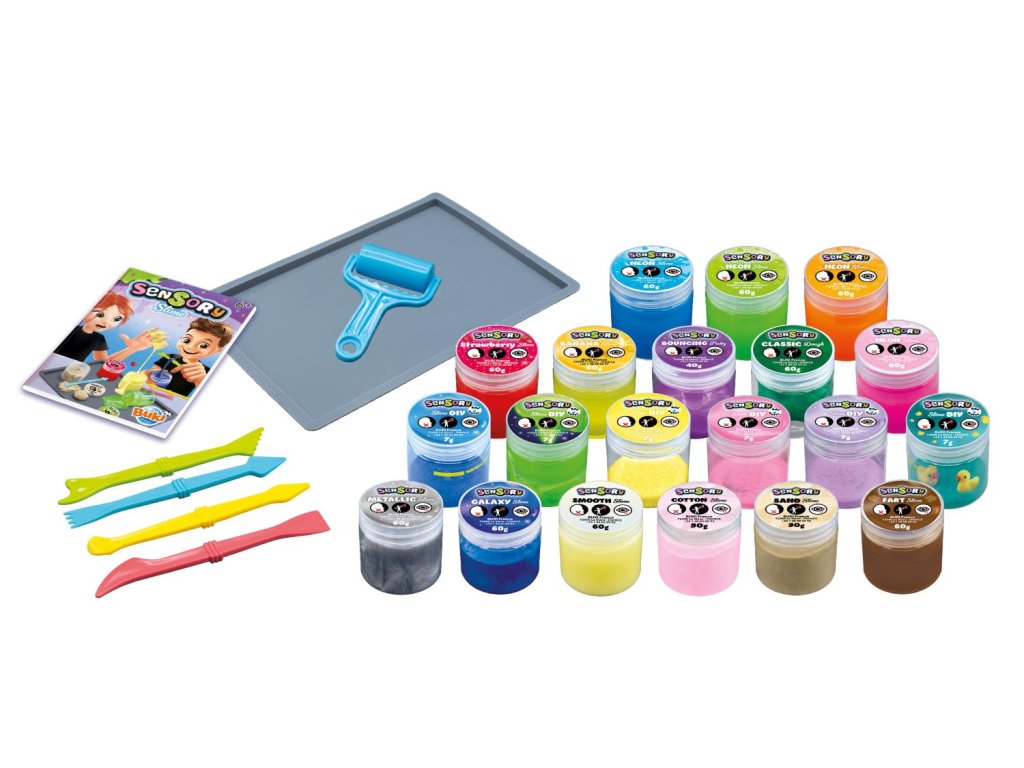 Velká sada senzorických slizů, kde každý jeden sliz je odlišný... jiná barva, jiný povrch, jiná lepivost, jiná pružnost atd. Sada má některé slizy již připravené v kelímcích a je možné si s nimi hrát a popisovat je. Další slizy/směsi snadno vytvoříte kombinací jednotlivých slizů. Použijte přiložené nástroje k tvarování, hnětení a míchání vašich slizů.
