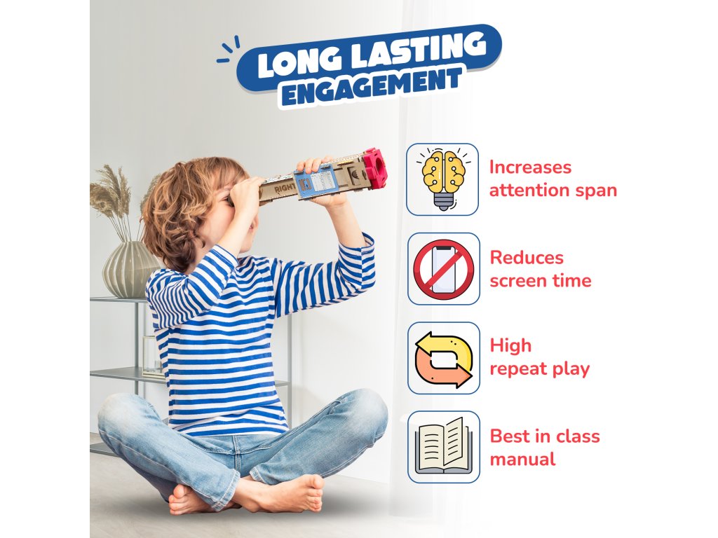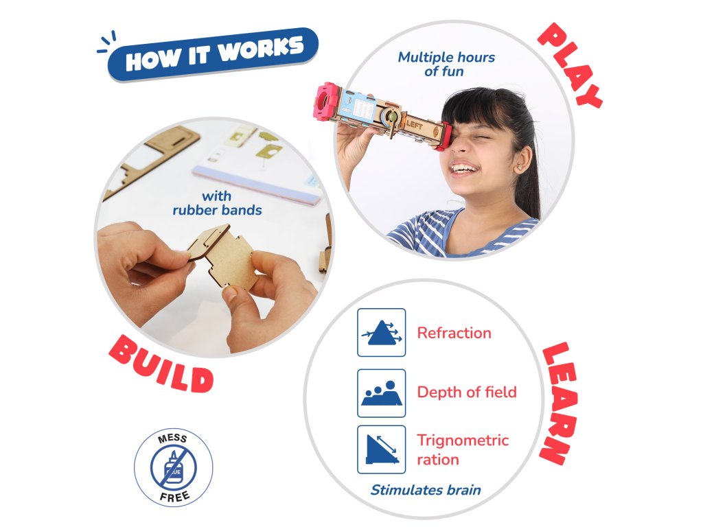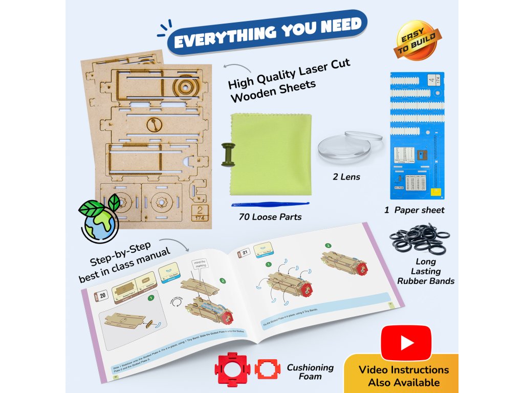 Jedná se o DIY (postav si sám) dalekohled / teleskop pro děti a mladší uživatele — stavebnici, ve které si dítě sestaví vlastní funkční dalekohled. Nejde o hotový plastový model, ale o konstrukční sadu, která nabízí praktickou zkušenost s optikou, stavěním a vědeckým pozorováním.