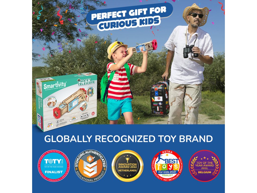 Kreativita a hra: téma „pirát-průzkumník“ podporuje fantazii a hru, dalekohled lze využít pro imaginární dobrodružství i skutečné výlety za pozorováním.